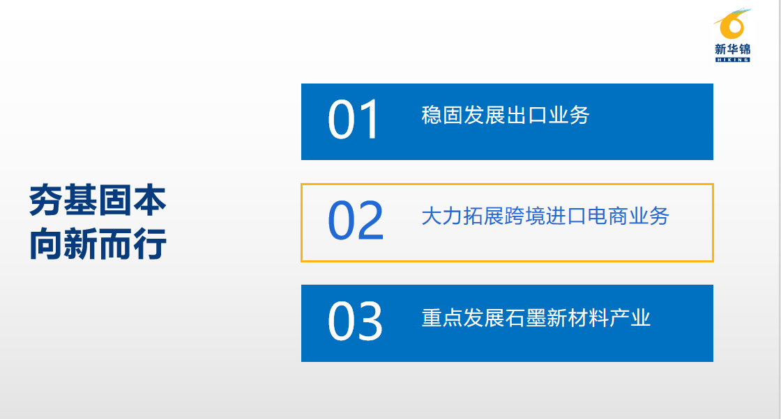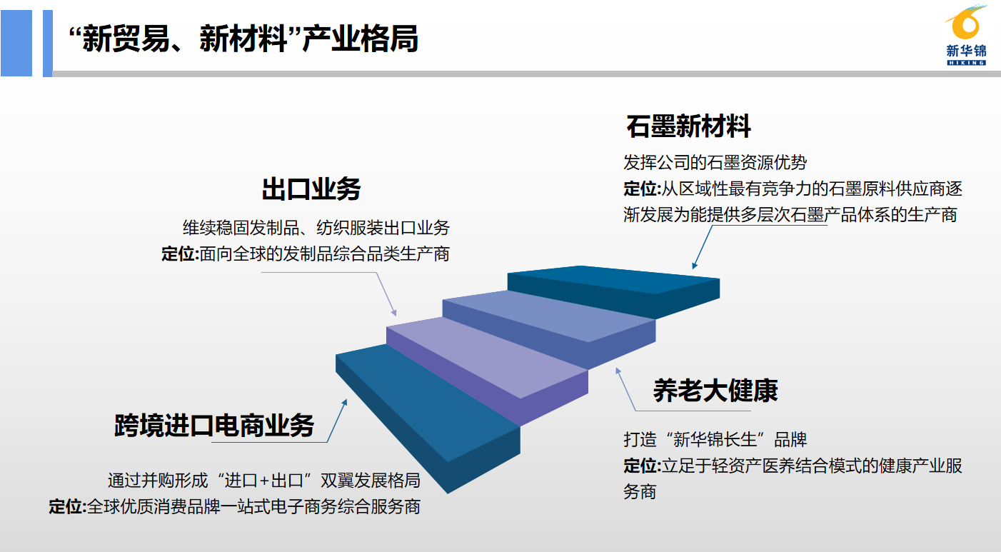 山東新華錦國際股份有限公司總部位于山東青島,是新華錦集團旗下A股上市公司。公司在國際貿易業務領域深耕多年,主營發制品和紡織品服裝產品的生產加工及業務出口業務,同時布局了石墨新材料產業和跨境進口電商業務,已逐步形成了“兩大核心戰略”“四個業務板塊”,初步建立了“新貿易、新材料”的產業格局。